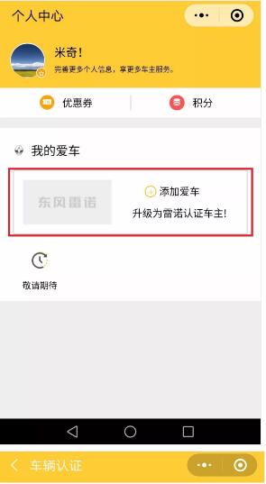 雷諾車主,廠家福利大派送 小諾準(zhǔn)備大聲地告訴您: 是時候動動手 把小諾為您準(zhǔn)備的精美禮品 帶回家啦! 一等獎:東風(fēng)雷諾云伴遠(yuǎn)程視頻車 二等獎:東風(fēng)雷諾反向傘 方便車主而貼心設(shè)計,大雨來臨之時,只需小小的車門縫,就可以開收傘自如。 三等獎:東風(fēng)雷諾定制手機支架 強韌有力的工藝設(shè)計,保證手機在行車途中不會晃動、掉落。讓開車接聽電話更安全。 諾米們是不是已經(jīng)按捺不住了 快跟著小諾 收下攻略,動動手指 把禮品帶回家吧! 先關(guān)注東風(fēng)雷諾車友會官方微信公眾號 返回東風(fēng)雷諾車友會主頁面,點擊左下角菜單欄【個人中心】,進入車主認(rèn)證通道。 認(rèn)真填寫愛車信息,上傳行駛證主頁、副業(yè)。在行駛證上能找到您的車輛識別代號和發(fā)動機號,再輸入手機號和驗證碼,即可綁定成功啦! 完成認(rèn)證,便可以開始抽獎啦!注意:一位車主只有一次抽獎機會哦。 如您中獎,您將會收到一條中獎短信通知 務(wù)必在1個月內(nèi)憑中獎短信到武漢法雷專營店領(lǐng)取禮品 *注:本次活動僅限未認(rèn)證會員的車主參與